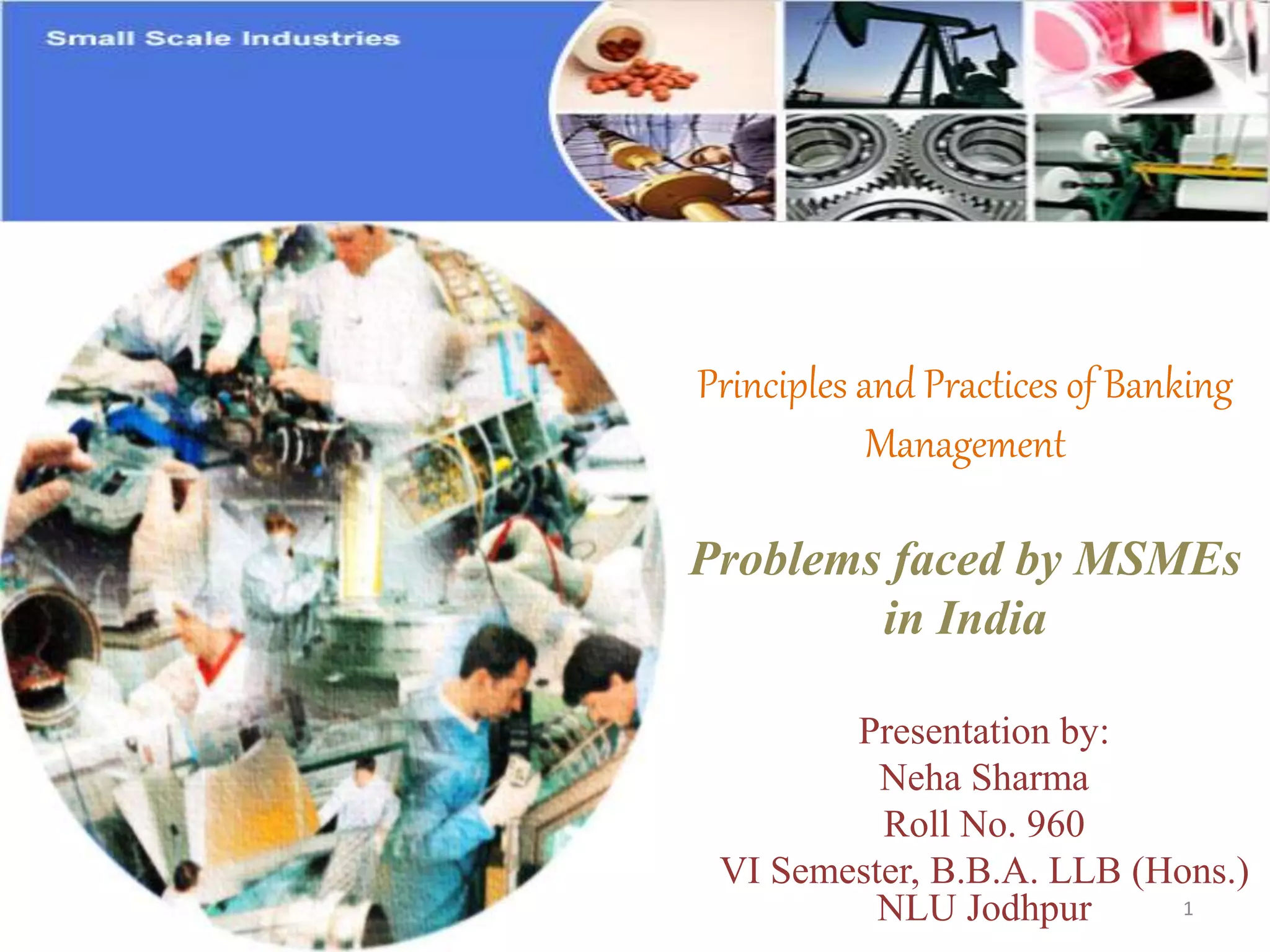 The document provides an overview of micro, small and medium enterprises (MSMEs) in India. It discusses the emergence and growth of MSMEs pre- and post-independence. It outlines the scope and importance of MSMEs, their contribution to the Indian economy, key government policies and institutions that promote MSMEs, factors affecting MSMEs, and challenges faced by MSMEs in India such as access to adequate and timely financing. The document also briefly touches on commercial bank services that promote MSMEs and the advantages of establishing MSMEs.