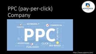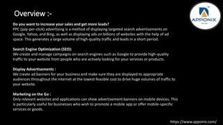 This document discusses pay-per-click (PPC) advertising through Apponix, a company that manages PPC campaigns on platforms like Google, Yahoo, and Bing. It offers search engine optimization to drive traffic from searchers and display ads to show targeted banners across the internet. Apponix also handles marketing on mobile devices and through video, shopping, and remarketing ads. The importance of PPC is highlighted as social media has become the new standard for companies to connect with customers and promote their brand in the digital world.