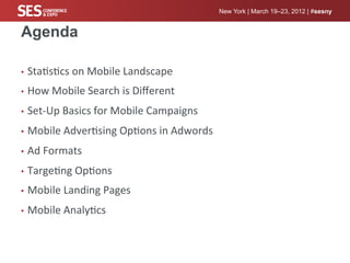The document discusses the growth and significance of mobile advertising, highlighting that by 2015, there will be over 7.1 billion mobile devices in use, with the U.S. mobile advertising market expected to reach $4.1 billion in 2012. It provides insights into mobile campaign setup, ad formats, and best practices for mobile landing pages to enhance user experience and conversions. Key takeaways emphasize the importance of extending online advertising to mobile platforms and understanding mobile user behavior.