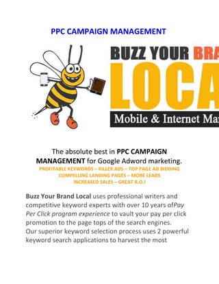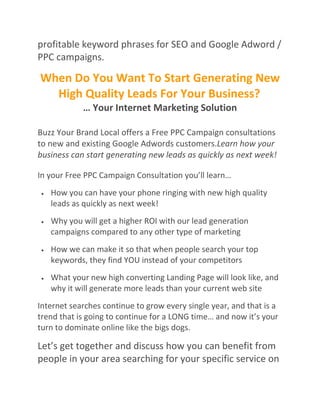 Buzz Your Brand Local offers expert PPC campaign management tailored for Google AdWords, focusing on profitable keywords and high-converting landing pages to drive sales and improve ROI. They provide free consultations for businesses to learn how to generate quality leads quickly, aimed at enhancing online visibility against competitors. With over 10 years of experience, they promise to create effective internet marketing solutions that leverage mobile and online strategies to give businesses a competitive edge.