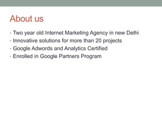 1) Socialmux is a 2-year-old marketing agency in New Delhi that offers Google Adwords and Analytics certification and specializes in search engine marketing, social media PPC advertising, and content marketing campaigns.