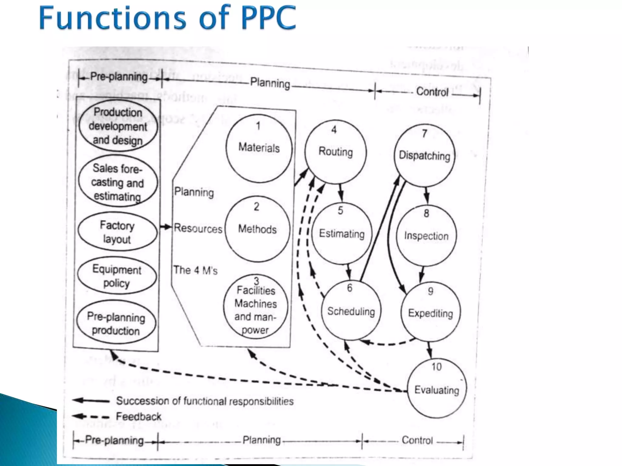 The document discusses production planning and control (PPC). It defines PPC as planning, coordinating, and controlling production activities to transform raw materials into finished products efficiently. PPC consists of production planning and production control. Production planning determines requirements for resources like materials, labor, and equipment. Production control implements production plans and ensures operations occur as planned through monitoring and corrective actions. The key goals of PPC are efficient resource utilization and producing quality products on schedule and budget.
