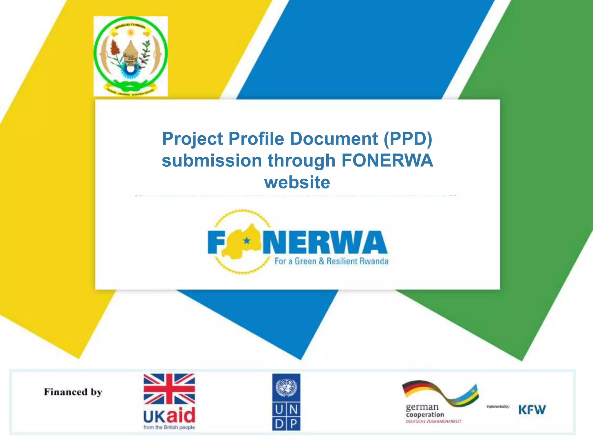 To submit a Project Profile Document (PPD) through the FONERWA website, one must first create an account by filling out the registration form. They can then start filling out the PPD form, saving it as a draft if needed. Before submitting, they must check the warning box to agree the PPD is complete. If submitted successfully, a confirmation message and email will be received. One can then submit additional PPDs or log out of their account.