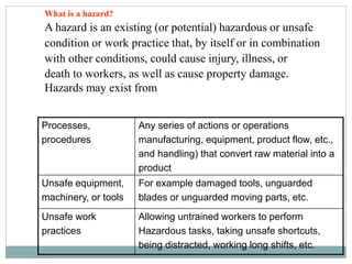 A hazard is any condition or practice that could cause injury, illness, or death to workers, and controlling these hazards involves various strategies including elimination, engineering controls, and personal protective equipment (PPE). The document outlines the importance of PPE in protecting against specific hazards, detailing requirements for clothing, head, eye, face, ear, hand, and fall protection. It emphasizes the hierarchy of controls, asserting that while PPE is vital, it should not be the sole method of hazard control.
