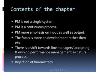 This document discusses performance management (PM) practices at several organizations. It notes that PM is not a single system, but rather a continuous process with an emphasis on both inputs and outputs. There is a shift towards line managers owning PM as a natural process. PM should be interlinked with other key processes like business strategy and employee development. At some organizations, PM is used as a culture change tool to improve two-way communication. PM focuses on both short-term and long-term objectives as well as personal and people development. The document also discusses performance-related pay, line manager ownership of PM, and rejecting bureaucracy in PM systems.