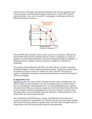 The document discusses key economic concepts including the production possibility frontier (PPF), opportunity cost, comparative advantage, and absolute advantage. It explains that the PPF represents the most efficient allocation of resources and shows the tradeoffs between producing different goods. Opportunity cost is the value of the next best alternative forgone. Countries specialize in producing goods where they have a comparative advantage in order to benefit from trade. Absolute advantage occurs when a country can produce more of both goods than another country.