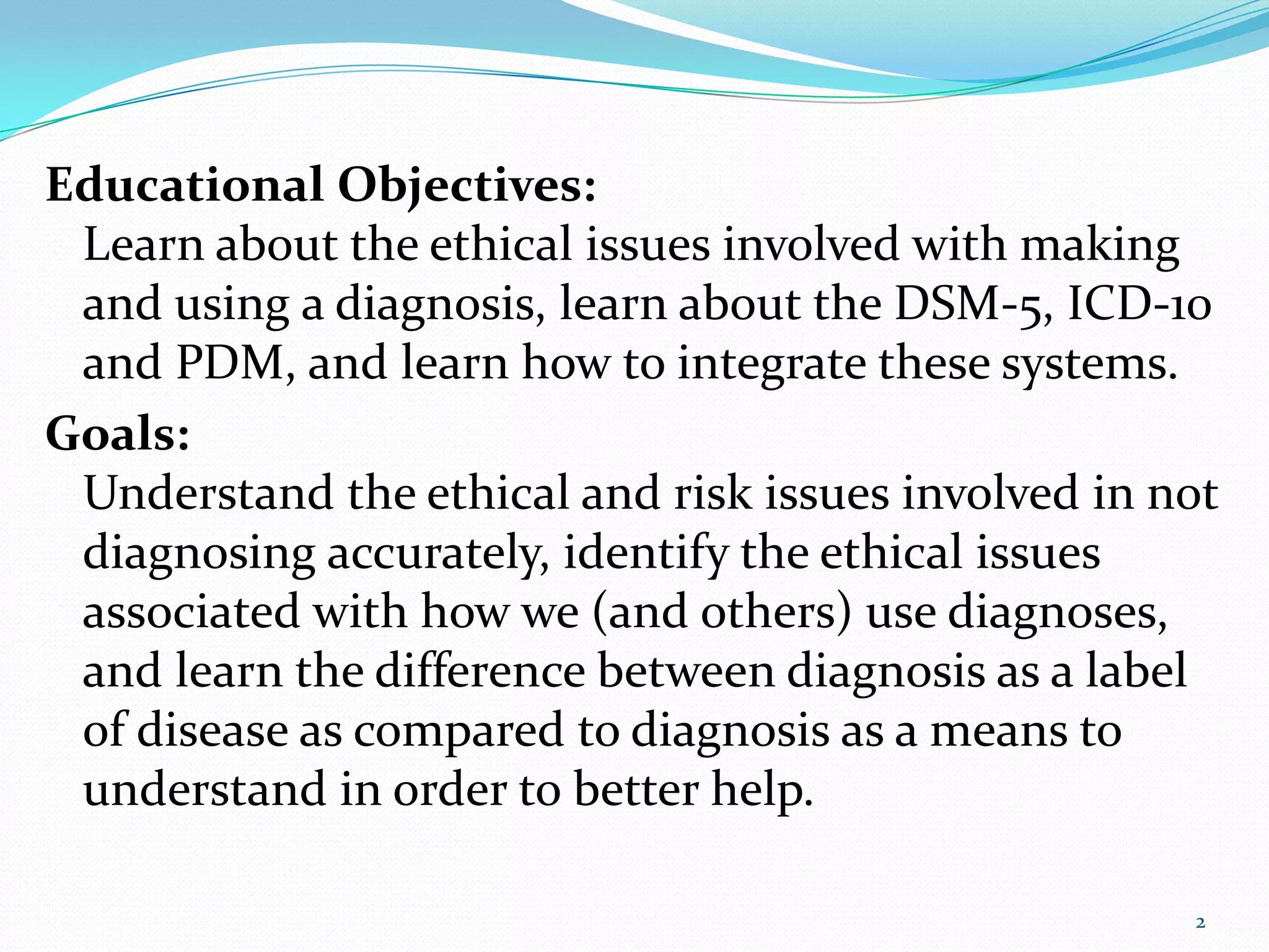 This document discusses the ethical issues involved in making diagnoses. It outlines the goals of understanding the risks of inaccurate diagnoses and how diagnoses are used and impact clients. The presentation will discuss general ethical principles of beneficence, non-maleficence, integrity and justice. It will also discuss potential harms of diagnoses, including misdiagnosis leading to ineffective treatment, stigmatization, and conflicts of interest.