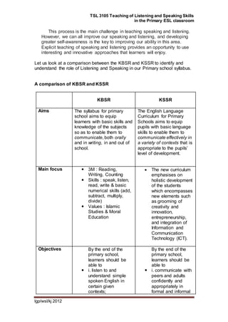 This document provides an overview of developing listening and speaking skills in the primary ESL classroom. It begins by comparing the KBSR and KSSR syllabi in Malaysia and identifying listening and speaking as core skills. Various techniques for teaching listening and speaking are then discussed, including identifying the top-down and bottom-up processes in listening, selecting appropriate activities based on student level, and designing principles for listening techniques. A range of activity types are suggested, from interactive to those focusing more on bottom-up or top-down skills. The document emphasizes the importance of authentic materials, motivating students, and explicitly teaching listening strategies.