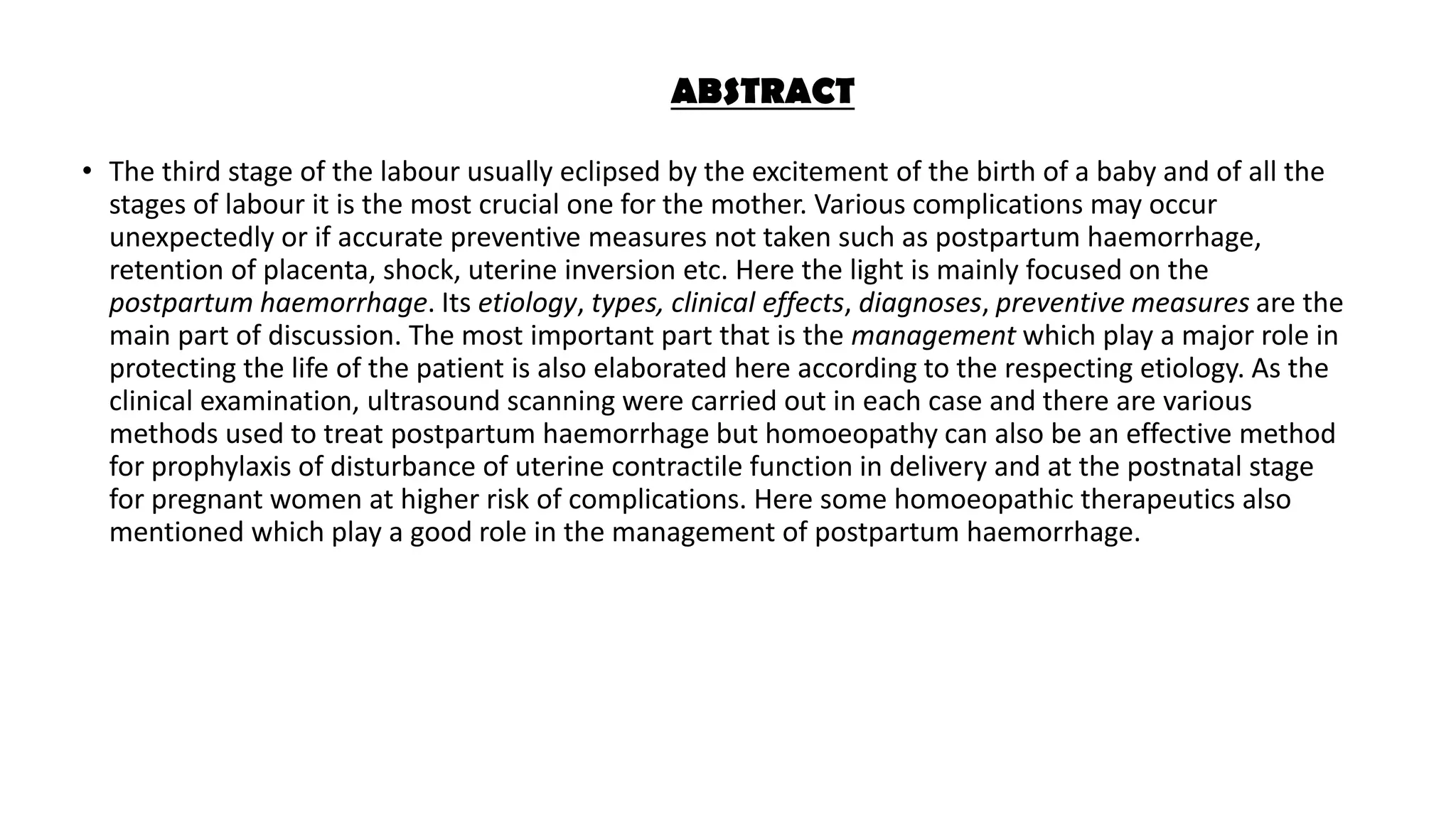 The third stage of labor, which involves delivery of the placenta, is the most crucial stage for the mother's health. A major complication is postpartum hemorrhage (PPH), excessive bleeding after childbirth. PPH can be primary (within 24 hours) or secondary (24+ hours later). The main causes of primary PPH are uterine atony (95%), retained tissue, trauma, and coagulopathy. Treatment involves controlling bleeding through uterine massage, medications, and in severe cases, surgery. While clinical examination and ultrasound are used for diagnosis, homeopathy may also help prevent PPH complications.