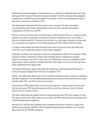 The UK Financial Services Authority found that complaints about mis-sold payment protection insurance (PPI) increased 85% in the last six months of 2011, totaling over 1 million claims. Major UK banks were overwhelmed by customers demanding compensation for improper PPI sales. PPI was insurance sold with loans and credit cards, but many customers were mis-sold policies when PPI was unnecessary, unrequired, or sold without consent. The spike in PPI complaints has increased claims against banks by 21% compared to the last half of 2011.