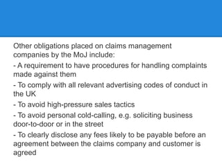 The Ministry of Justice places several obligations on claims management companies, including having procedures to handle complaints, complying with advertising codes of conduct, avoiding high-pressure sales tactics or cold-calling, clearly disclosing any fees before agreements, and allowing customers a 14-day cooling off period to withdraw. Large numbers of PPI complaints are referred to the Financial Ombudsman Service, an independent organization set up by the government to adjudicate financial services complaints where the complainant and organization disagree.