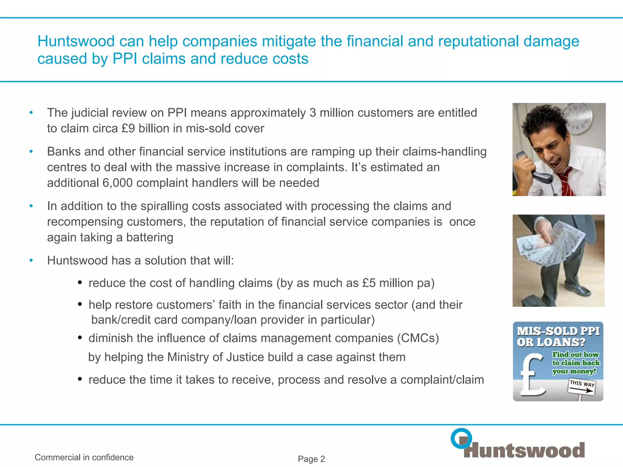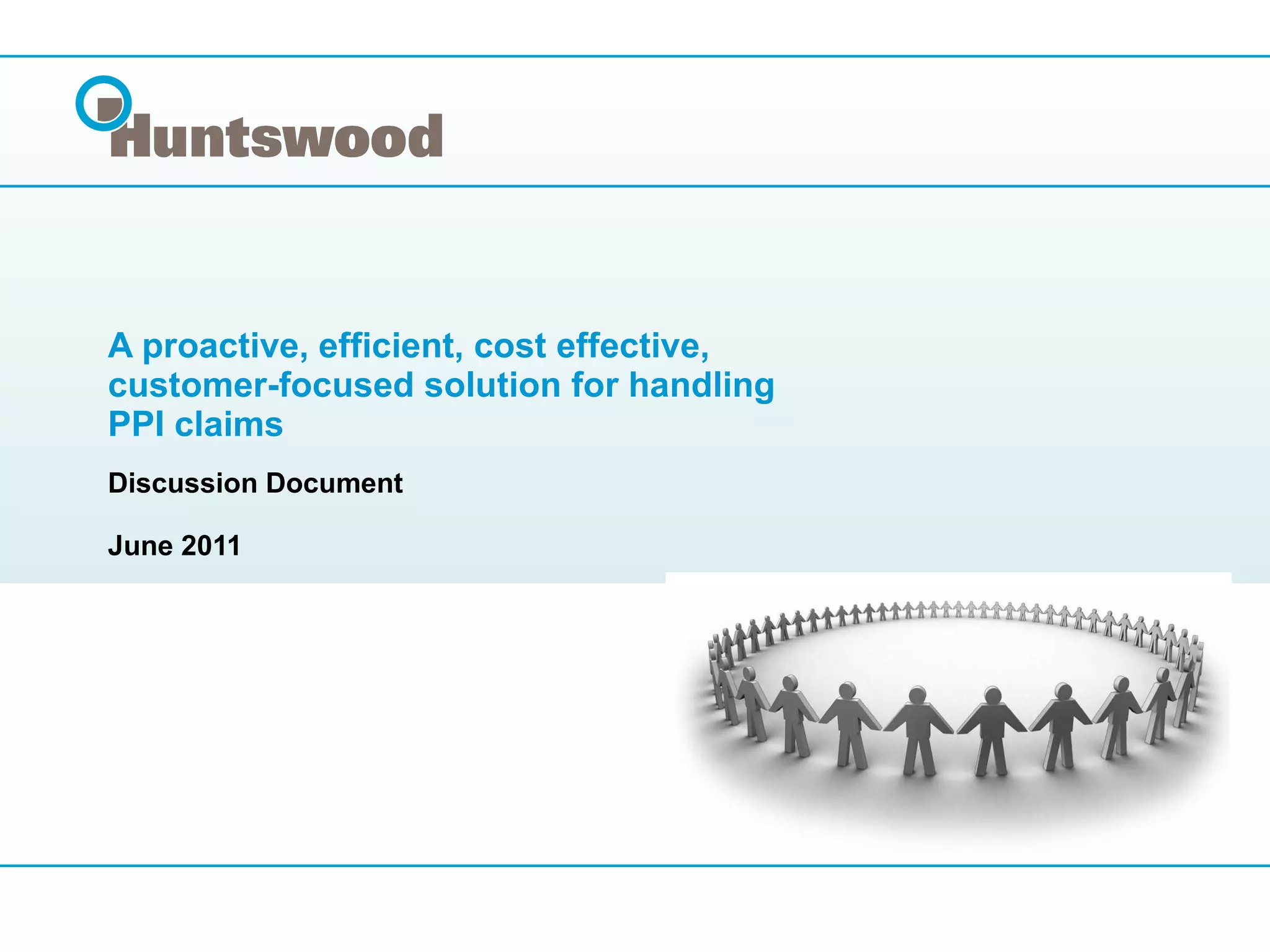 Huntswood provides a proactive, efficient, and cost-effective solution for handling PPI claims to help financial institutions mitigate damage, reduce costs, and restore customer trust. Their solution involves proactive customer outreach, a customer support team to quickly validate and resolve claims, and complaint handling to process claims and provide redress, saving up to £5 million per year. Financial institutions can outsource the entire end-to-end claims process or elements to Huntswood to enhance customer experience, reduce costs, and rebuild trust in their brand.