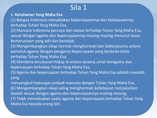 Dokumen tersebut membahas lima sila Pancasila sebagai dasar negara Indonesia. Sila pertama membahas ketuhanan yang maha esa, sila kedua membahas kemanusiaan yang adil dan beradab, sila ketiga membahas persatuan Indonesia, sila keempat membahas kerakyatan yang dipimpin oleh hikmah kebijaksanaan dalam permusyawaratan/perwakilan, dan sila kelima membahas keadilan sosial bagi seluruh rakyat Indonesia.
