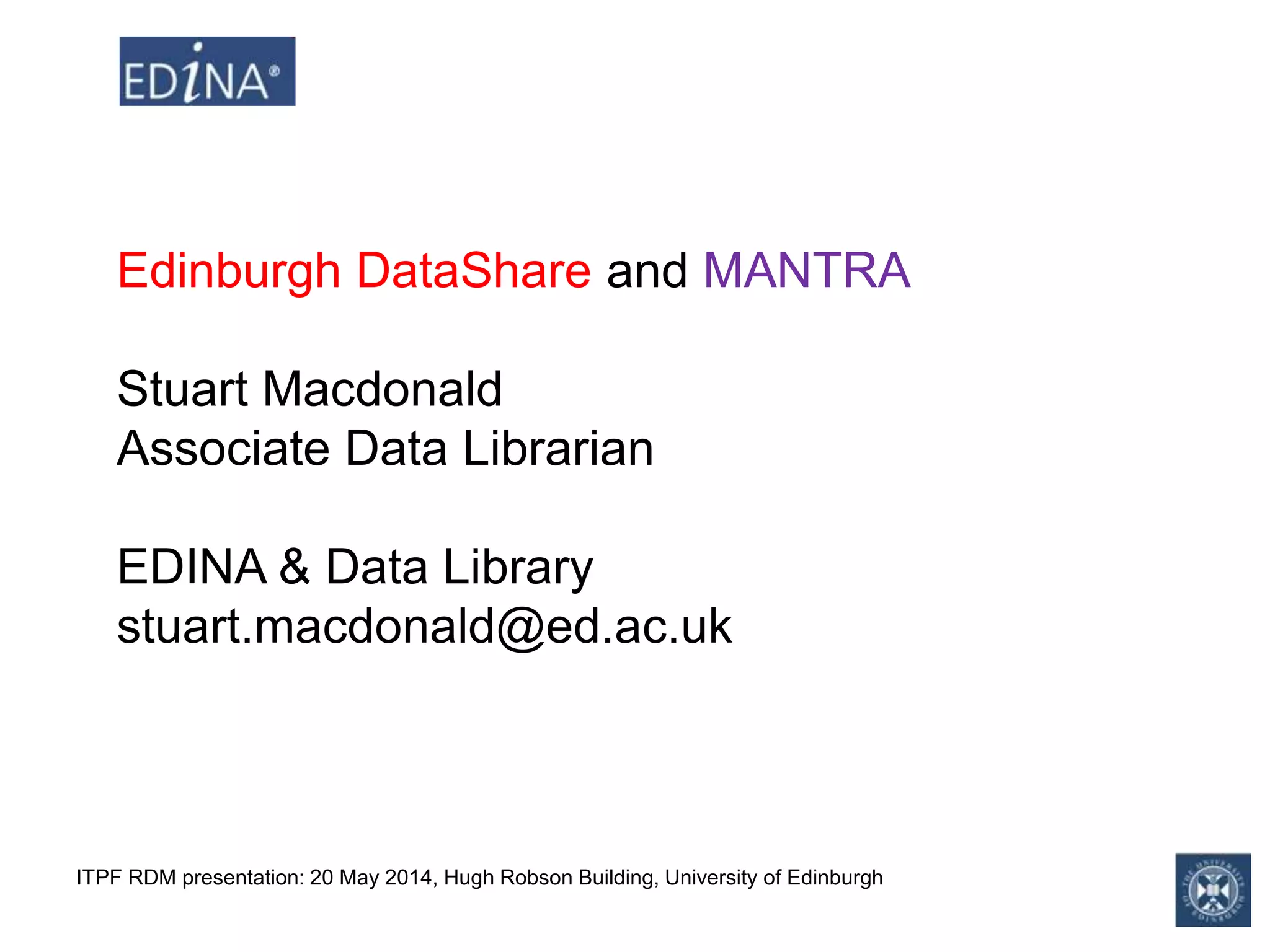 The document outlines the services provided by the Edinburgh Data Library and EDINA, highlighting their role in supporting research data management and sharing. It discusses various projects, such as the Edinburgh Datashare and Research Data Mantra, which focus on facilitating access, use, and preservation of research data, as well as providing educational resources for managing research data. The presentation aims to promote data sharing and improve research efficiency through developed online services and infrastructure backed by Jisc funding.