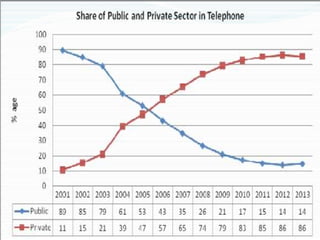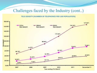 The Indian telecom sector has undergone significant changes since the 1970s. It started as a state-run monopoly but has since transitioned to a competitive private sector dominated market. Major reforms included allowing foreign investment, introducing private operators, and establishing an independent regulator. As a result, tele-density increased dramatically from 5% in 1999 to over 75% currently. However, intense price competition has led to declining revenues per user, posing financial challenges for operators in the saturated market. The oligopolistic industry is projected to consolidate further with only a few large players dominating in the coming years.