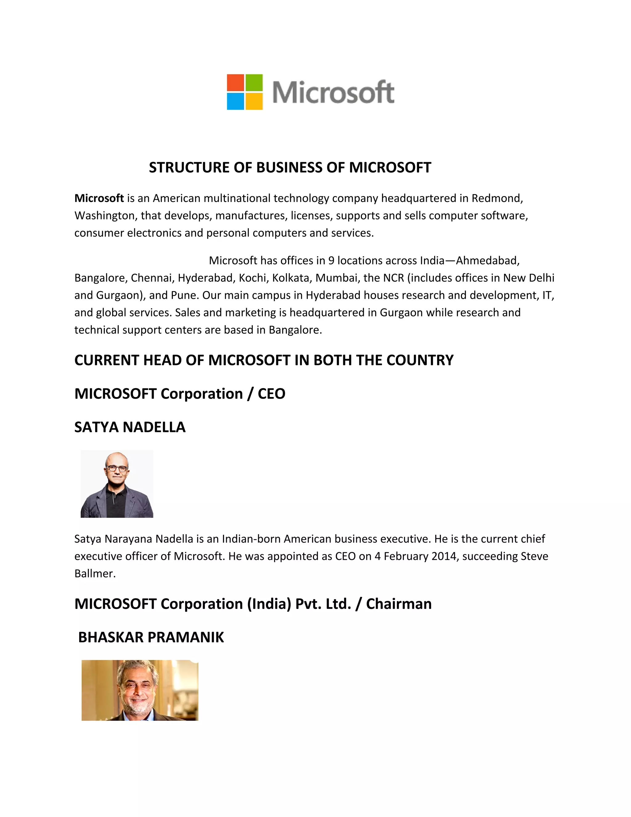 Microsoft is a multinational technology company headquartered in Redmond, Washington. It has offices across 9 locations in India, including major offices in Hyderabad, Gurgaon, and Bangalore. Satya Nadella is the CEO of Microsoft, and Bhaskar Pramanik is the Chairman of Microsoft Corporation (India) Pvt. Ltd. Key business functions in the US and India are led by executives such as Kathleen Hogan, Amy Hood, Chris Capossela, Rohit Thakur, Anil Bhansali, and Hiren Israni. Microsoft Corporation (India) engages in software development, sales, and marketing in India as a subsidiary of the US-based Microsoft
