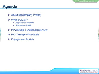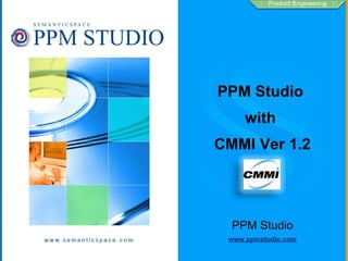 The document discusses PPM Studio, a software tool that helps organizations implement CMMI processes. It provides an overview of PPM Studio's functionality, licensing models, and integrations. PPM Studio uses a staged representation to help organizations progress through CMMI maturity levels from initial to optimized. It supports key process areas at each level to help improve processes and productivity.