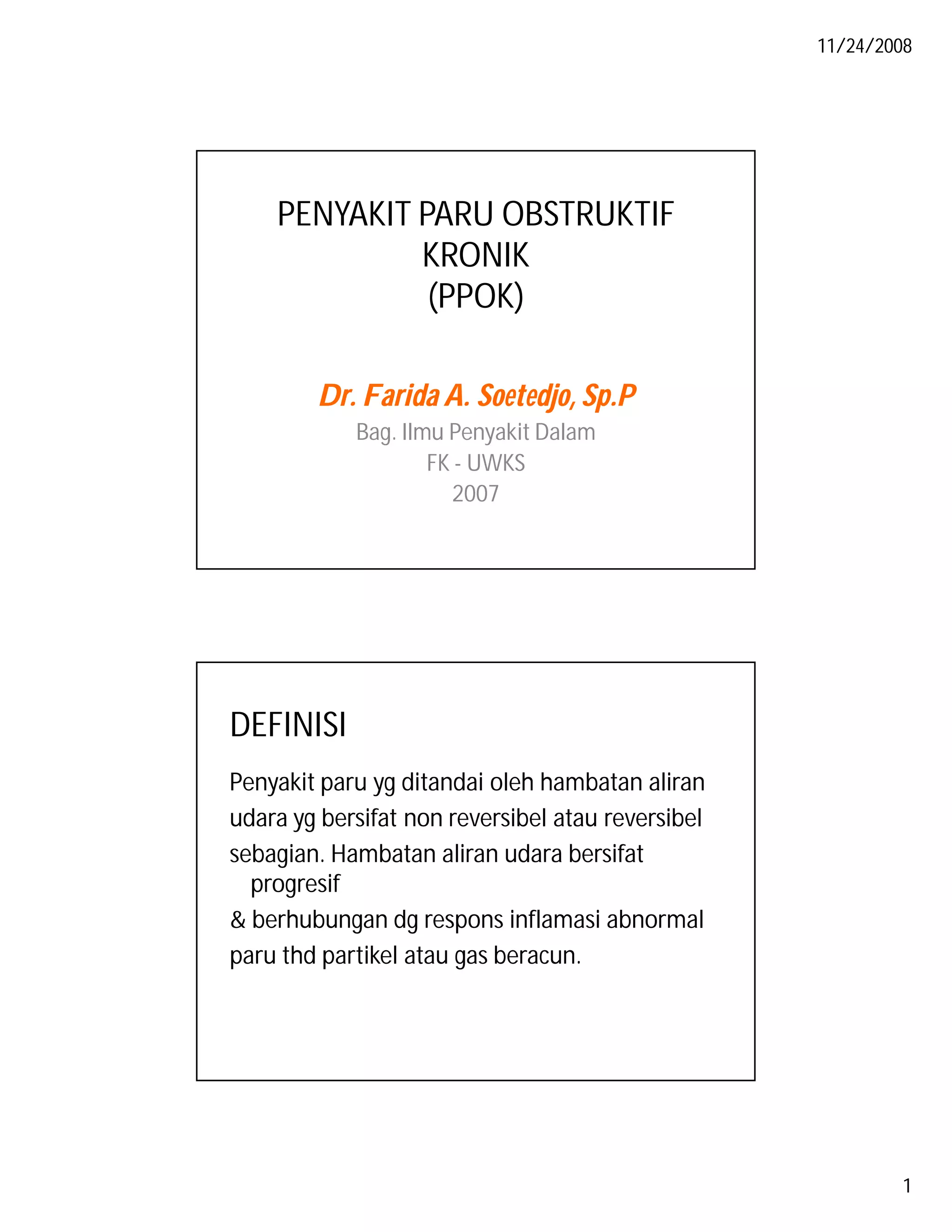 1. Penyakit paru obstruktif kronik (PPOK) merupakan penyakit paru yang ditandai dengan hambatan aliran udara yang bersifat tidak dapat dipulihkan kembali sebagian.