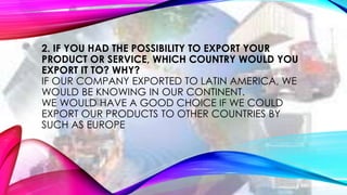 The document discusses a company that offers products and services for both males and females. It suggests that by providing good customer service, the company could become recognized in other countries. It also states that exporting products to Latin America or Europe would allow the company to become known on other continents and have success. The company believes it could contribute to Colombia's economy by generating more jobs and reducing unemployment levels.