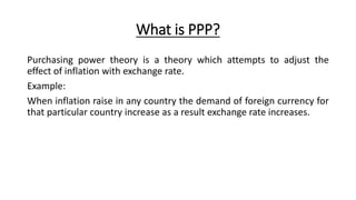 1) Purchasing power parity (PPP) suggests exchange rates adjust for inflation, but it does not hold for Pakistan-US rates due to imperfect substitutes between goods and other factors influencing exchange rates.