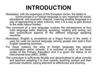 1. The document discusses foreign language education in primary schools in Spain. It emphasizes the importance of learning foreign languages for social, educational, and economic reasons.