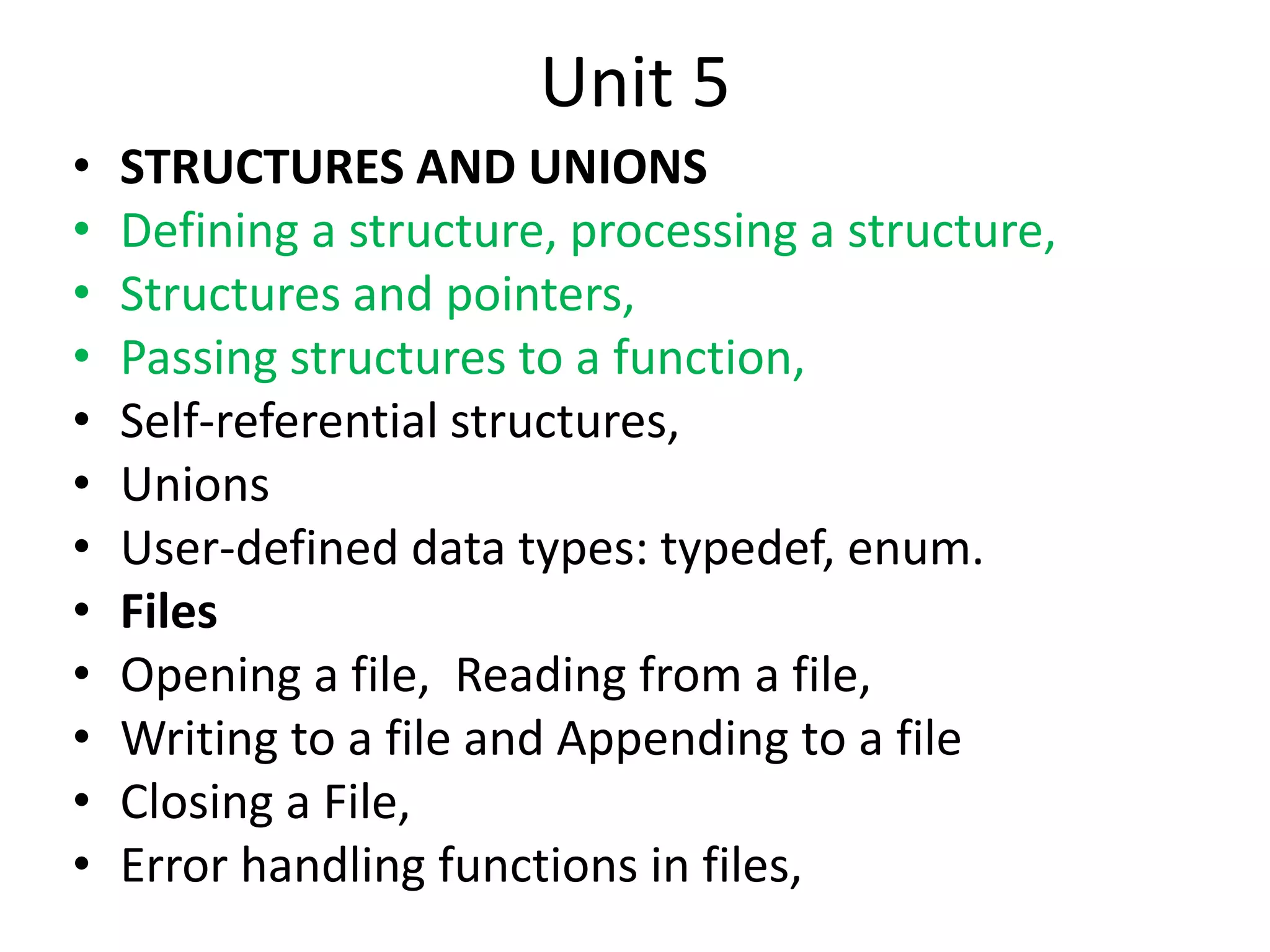 1) Defining structures and unions, passing structures to functions, self-referential structures.