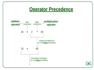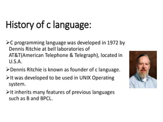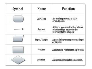 The document provides an overview of programming concepts including computer systems, programming languages, algorithms, flowcharts, and the C programming language. It discusses the components of a computer system including hardware and software. It describes different types of programming languages from machine languages to high-level languages. It explains algorithms, properties of algorithms, and provides examples. It also discusses flowcharts for representing algorithms graphically and the steps to create, compile, and execute a C program.