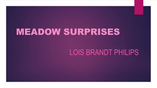 Lois Brandt Philips is an American poet, playwright, and author of over 50 books for children and adults. The poem Meadow Surprises describes walking softly through the velvet grass of a meadow and listening to the sound of a brook, suggesting that paying attention allows one to discover the hidden surprises a meadow contains. Key terms such as meadow, surprise, velvet, and brook are defined in a glossary.