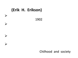 Erik Erikson was a developmental psychologist who developed one of the most widely accepted theories of psychosocial development. He proposed that social development occurs through eight stages of psychosocial development from infancy to late adulthood, with each stage presenting its own developmental crisis which contributes to the person's development of identity and sense of self. His stages focus on how children and adults experience a sense of trust, autonomy, initiative, industry, identity, intimacy, generativity, and integrity at different points in their lives.