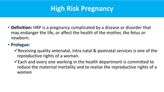The document outlines strategies for the prevention, detection, tracking, and management of high-risk pregnancies (HRP) as part of maternal health services. It emphasizes the importance of quality antenatal care, early detection of HRP, and functional referral linkages between health facilities. Additionally, it details the roles and responsibilities of health care workers in providing preconception care, monitoring, and emergency response frameworks to enhance maternal and neonatal outcomes.
