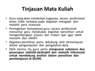Dokumen ini membahas tentang mata kuliah statistika pendidikan yang meliputi pengertian statistika deskriptif dan inferensial untuk menunjang kegiatan penelitian dan pembelajaran. Mata kuliah ini membekali guru dengan kemampuan pengolahan data untuk menganalisis hasil belajar siswa dan mengembangkan proses pembelajaran. Modul belajar mata kuliah ini meliputi pengertian statistik, tendensi sentral dan variabilitas data, analisis korelasi