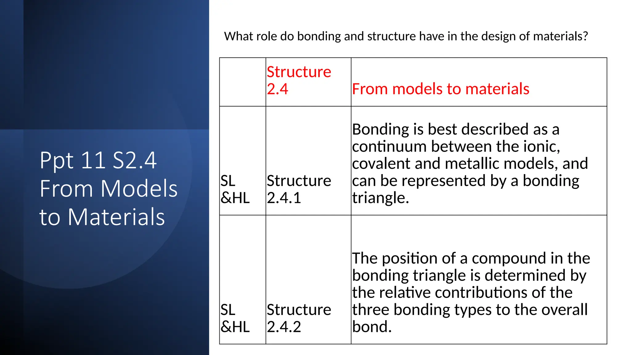 The document discusses the continuum of bonding types—ionic, covalent, and metallic—and how they can be represented in a bonding triangle. It covers the classification of materials based on their uses, properties, and structure, referencing a Van Arkel-Ketelaar diagram to position various compounds. Additionally, it addresses topics like electrical conductivity, elasticity, brittleness, and ductility in the context of different material types.