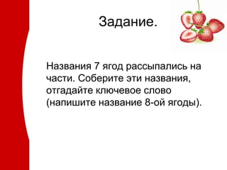 Документ представляет собой задание-головоломку, в которой необходимо собрать названия 7 ягод из рассыпанных букв. Участникам предлагается отгадать ключевое слово, добавив название 8-ой ягоды. Задание включает в себя различные подсказки и буквы для поиска ягод.
