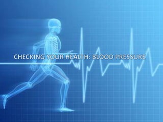 Blood pressure refers to the force that blood exerts against vessel walls, represented by systolic and diastolic pressures. Blood pressure is determined by cardiac output and peripheral resistance. Postural hypotension is a sudden drop in blood pressure when moving from lying to standing. Hypovolemia and hypervolemia refer to abnormally low or high blood volume. Measuring blood pressure involves using a sphygmomanometer and stethoscope to listen for sounds over the brachial artery at different cuff pressures.