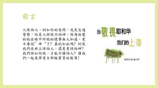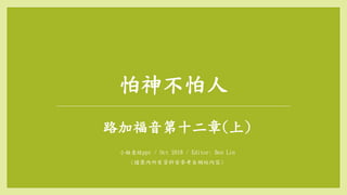 文档探讨了人对人和对神的恐惧,强调应对神的敬畏而非对人恐惧。通过案例和路加福音的教导,引导信徒思考如何不被他人看法所影响,同时警示假冒为善和褻瀆圣灵的后果。最终提醒基督徒应公开承认基督,以免落入被弃绝的境地。
