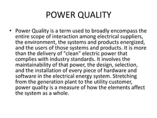 This document discusses power quality issues and potential solutions. It describes various power quality problems like voltage sags, swells, transients, and harmonic distortion. It then outlines several methods to address these problems, including using hybrid filters, transformer methods, coil clocks, power factor correction, and unified switched capacitor compensators. The benefits of improved power quality are also summarized.