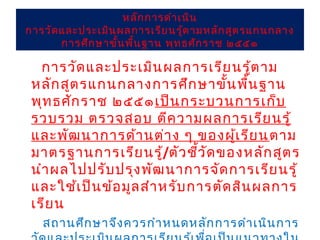 สรุปแนวปฏิบัติการวัดและประเมินผล ตามหลักสูตรแกนกลางการศึกษาขั้นพื้นฐาน พุทธศั... PPT