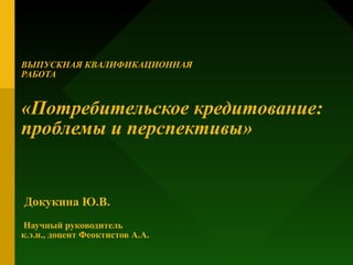 Выпускная квалификационная работа анализирует состояние и перспективы потребительского кредитования в России, включая классификацию кредитов и данные о динамике кредитования физических лиц. Рассматриваются основные риски, связанные с рынком кредитования, такие как конкурентные, макроэкономические и процентные риски. Также представлены прогнозы по росту различных кредитных продуктов и их потенциальному влиянию на экономику.