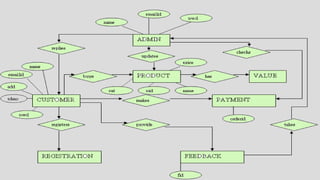 The document presents the requirements for an online shopping system. It includes functional requirements like allowing customers to shop online anywhere, view product information and categories, reserve products, and receive email updates. Non-functional requirements include usability, efficiency, performance, reliability and portability. The system requires hardware, software for the client and server sides, and tools like Visual Studio. It consists of modules for administration, stores, offers, user registration/profiles, feedback, and payment/dispatch. Entity relationship, data flow, and user interface design diagrams are provided.
