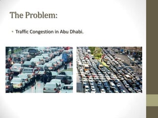Traffic congestion in Abu Dhabi has increased due to rising population, availability of jobs, and high car ownership. This has led to more accidents, delays, pollution, and road rage. The government is trying to address this problem by expanding roads and bridges, implementing flexible work hours and parking systems, and improving public transportation. Individuals can help by avoiding traffic times and following traffic laws.