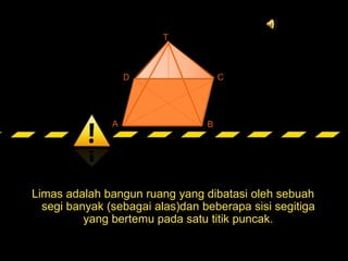 Limas adalah bangun ruang yang dibatasi oleh sebuah segi banyak dan sisi-sisi segitiga yang bertemu pada satu titik puncak. Terdapat dua jenis limas, yaitu limas sembarang dan limas beraturan, yang dibedakan berdasarkan bentuk alasnya dan jarak antara titik puncak dengan pusat alas. Unsur-unsur penting limas adalah rusuk, titik sudut, bidang alas, bidang sisi tegak, titik