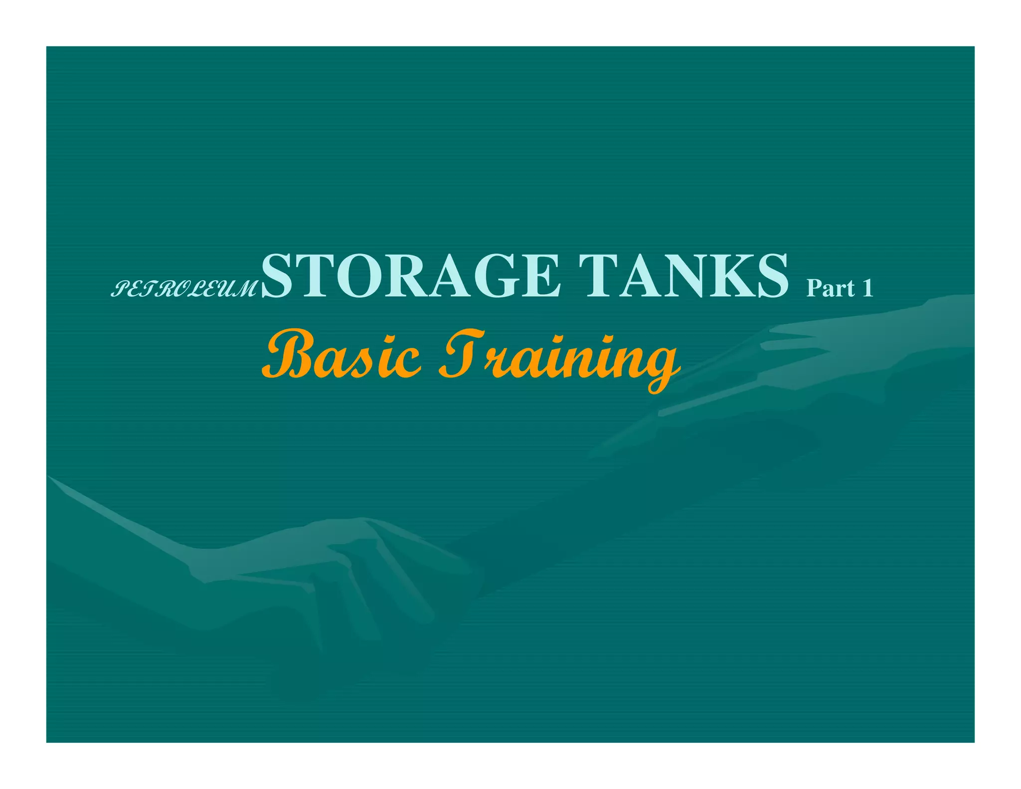 This document provides an overview and summary of a basic training course on petroleum storage tanks. It discusses various tank types including fixed roof tanks, internal floating roof tanks, and floating roof tanks. It covers tank design elements like the structure of the tank bottom and floor, thickness of bottom plates, and attachment of the bottom to the shell. It also addresses tank foundations, including the need for foundations to allow for leak detection. The goals of the training are identified as learning to identify tank types and equipment, understand tank limitations, perform volume calculations, and operate tanks safely.