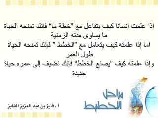 يتناول المستند موضوع التخطيط وأهميته في تحقيق الأهداف، حيث يركز على كيفية إعداد خطة سليمة تشمل تحديد الأهداف، التشخيص، وتنفيذ الخطة مع مراعاة التغذية الراجعة. ويتضمن أيضًا تحليل نقاط القوة والضعف والفرص والتهديدات المتعلقة بالعملية التخطيطية.