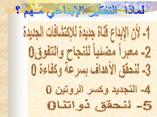 يتناول النص فكرة ضرورة الإبداع واحتياجات الإنسان الأساسية وفق نموذج ماسلو، حيث يتم تصنيف الحاجات إلى فسيولوجية وأمن وحب واحترام وتحقيق الذات. كما يشير إلى أساليب متعددة لتعزيز الإبداع، مثل العصف الذهني وتقييم الأفكار، ويستعرض طرقًا لتحفيز الأفراد على الابتكار في مختلف المجالات. يُبرز أيضًا كيف أن الإبداع يعتبر حلاً للتغلب على المشاكل والتغيير المستمر.
