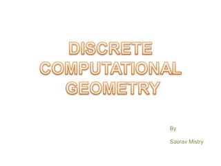 Computational geometry is the study of algorithms for manipulating geometric objects. It deals with problems involving geometric input and digital output. The goal is to provide basic geometric tools for applications in computer graphics, computer vision, robotics, and more. While it primarily focuses on flat 2D objects, discrete computational geometry bridges the gap between continuous phenomena and computer representation by approximating geometry discretely. Key applications of discrete computational geometry include convex hulls, triangulations, and Voronoi diagrams. Common algorithms for finding the convex hull include Jarvis march, Graham's scan, and divide and conquer approaches.