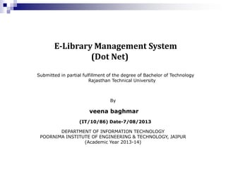 This document describes a seminar presentation for an E-Library Management System project created using .NET technology. The project was developed by Veena Baghmar for her final year practical training and submitted in partial fulfillment of a Bachelor of Technology degree. The presentation covers the significance of the training, company profile where the training took place, technology used including C# and ASP.NET, overview of the project including features and architecture, demonstration of the project, and conclusions.