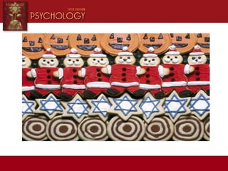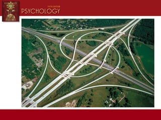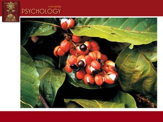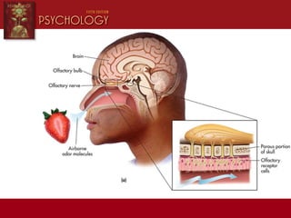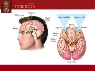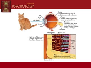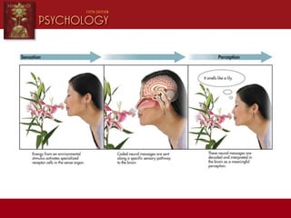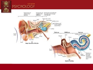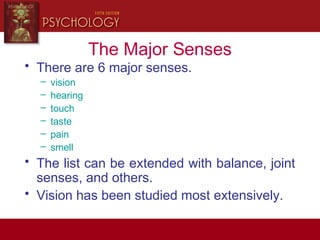 The document provides an overview of sensation and perception. It discusses the six major human senses of vision, hearing, touch, taste, smell, and balance. It then examines principles of sensation such as thresholds and adaptation. Specific sections cover the anatomy and physiology of vision, including light reception, color vision, and depth perception. Hearing is reviewed including sound waves, ear anatomy, and pitch and loudness perception. Other senses like smell, taste, touch, pain, and kinesthesia are introduced. The document concludes with topics in perception such as perceptual organization, figure-ground relationships, constancies, and influences of expectations.