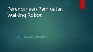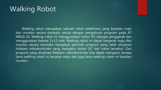 Dokumen ini menjelaskan perencanaan pembuatan robot berjalan sederhana yang dapat bergerak maju dan mundur secara otomatis menggunakan mikrokontroler ATmega16. Perlengkapan yang dibutuhkan termasuk motor, komponen elektronik, dan software untuk pemrograman. Langkah kerja mencakup persiapan, pembuatan program, penghubungan komponen, dan pengujian robot setelah diprogram.