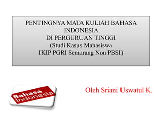Dokumen ini mengungkapkan pentingnya mata kuliah bahasa Indonesia di perguruan tinggi, terutama bagi mahasiswa non-PBSI, agar mereka dapat menguasai bahasa dengan baik di era globalisasi. Penelitian menunjukkan bahwa mata kuliah ini memiliki pengaruh besar dalam penulisan karya ilmiah dan pemeliharaan bahasa Indonesia sebagai bahasa persatuan. Ditekankan bahwa semua generasi muda, termasuk mahasiswa, harus berperan aktif dalam melestarikan bahasa Indonesia.