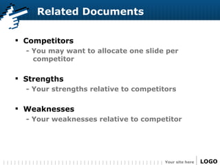 This PowerPoint template provides guidance on conducting a competitive analysis by suggesting slides on competitors' strengths and weaknesses compared to your own company, as well as slides on your company's strategy, challenges, and conclusions. The template includes sections for an introduction, strategy, challenges, and conclusion and suggests including text, subtext, and charts to analyze competitors and your company's position in the market.
